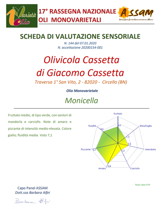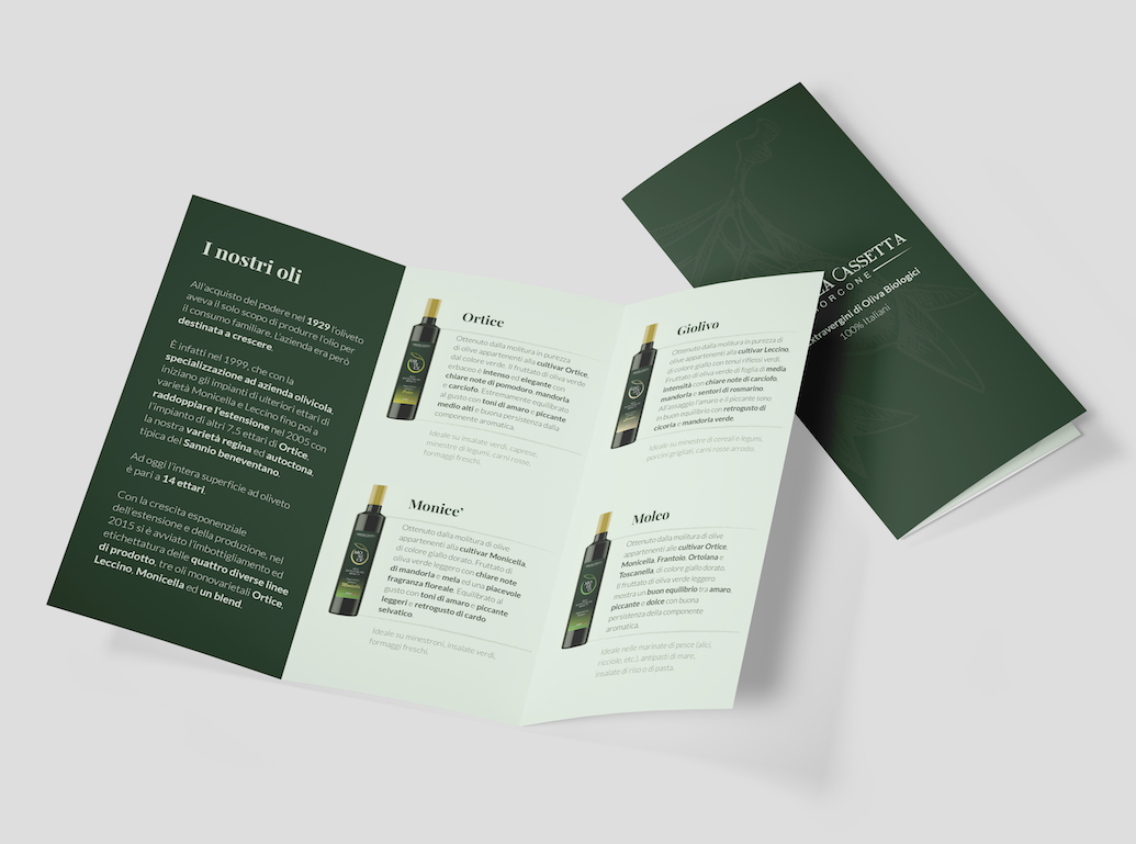 Nel 1999, con la specializzazione ad azienda olivicola, sono stati impiantati i primi 3 ettari con la varietà Monicella (varietà originaria della Valle Roveto in provincia dell’Aquila), nel 2000 è stata introdotta la varietà leccino con l’impianto di circa 1,15 ettari. Nel 2004 con una superficie olivetata di ettari 4,15, è stata effettuata la conversione al biologico, perseguendo il principio della massima salubrità degli alimenti prodotti nel massimo rispetto dell’ambiente. Nel 2005 sono stati impiantati i primi 5 ettari di Ortice, varietà tipica del Sannio beneventano. Nel 2008 sono stati impiantati altri 2,3 ettari della varietà Ortice. Nel gennaio del 2016 con l’impianto di 2,5 ettari ad Ortice è stato completato l’investimento dell’intera SAU aziendale ad olivo.